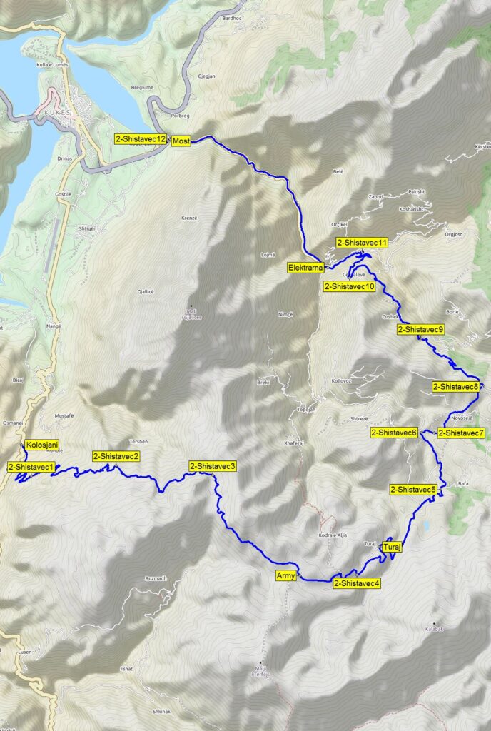 V údolíčku je cesta trochu zmatená, směr by byl správně přímý, ale používaná cesta vede oklikou. Sledujte postupně body (2-Shistavec5) na křižovatku s větší cestou (2-Shistavec6) a (2-Shistavec7). Přes vesnici Novosej dojedete na křižovatku (2-Shistavec8). Doprava po hlavní cestě Shistavec. Doleva po-kračování do údolí. Přes vesnici, jméno jsem nenašel, asi Nimce, pokračujte po úzké cestě serpentinami dolů do kaňonu. Závěr cesty je vysekaný ve skále a vyjedete u elektrárny (Elektrarna) na asfalt. Do Kukës je asfalt, jen pod dálnicí je obtížné trefit výjezd na most. V opačném směru bude obtížné tuto odbočku najít (2-Shistavec12).