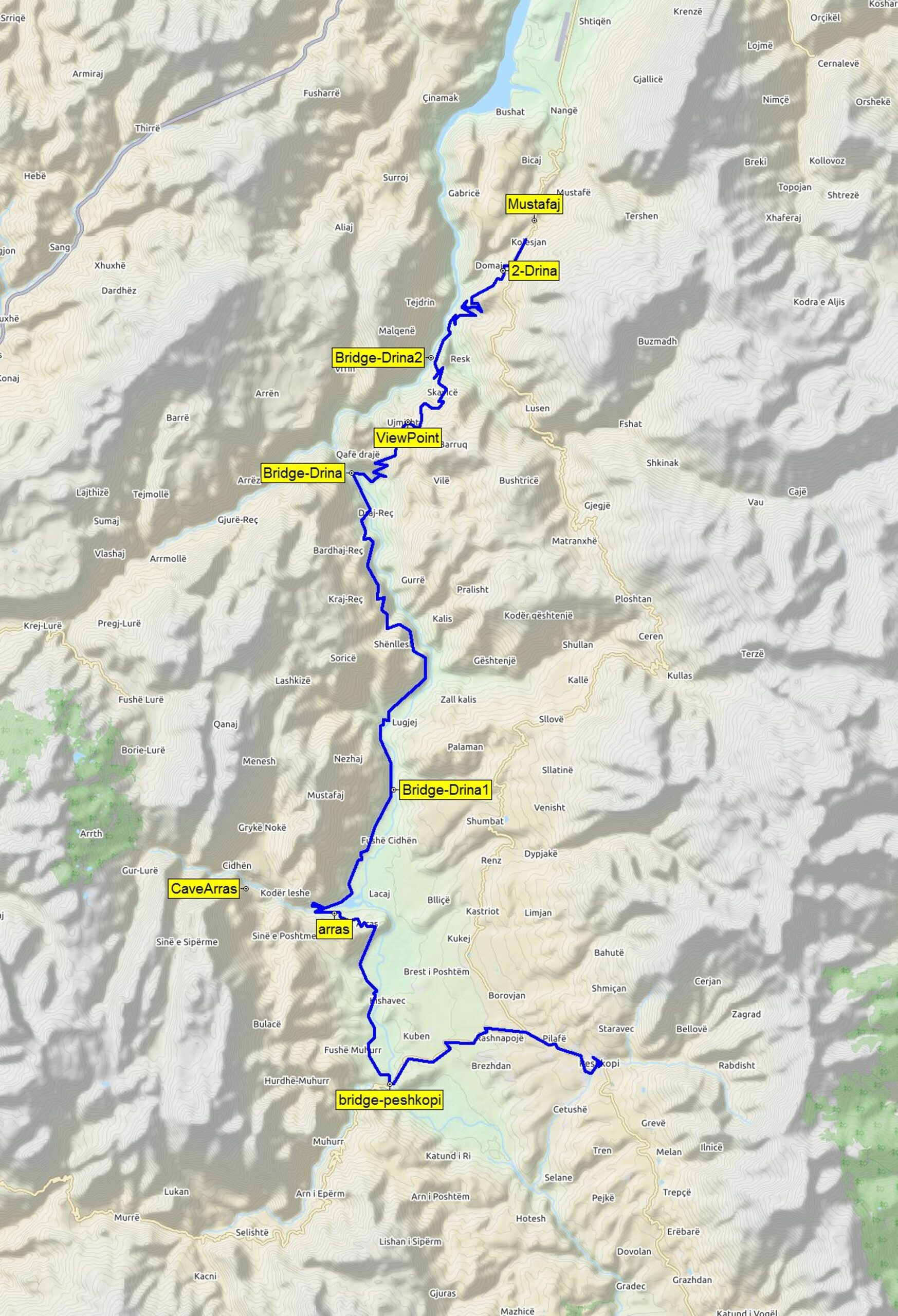 Pod Peshkopi u pumpy minete odbočku na novou as-faltovou cestu a sjedete do údolí na most (bridge-peshko-pi). Pak za restaurací doprava na Arras, tady jsou rybí sádky. V Arras za mostem je doleva odbočka na Lurská jezera. Pak po-řád za nosem. Minete nový most (bridge-drina1), přes který se dostanete na Beska Zonjave a Radomira. Asi po 20 km je další most (bridge-drina). Za ním se cesta vyhoupne do sedla, pak ještě jednou dolů k mostu (bridge-drina2) a nahoru před Mustafaj (Ko-lashin), kde se napojí na novou asfaltovou silnici.
