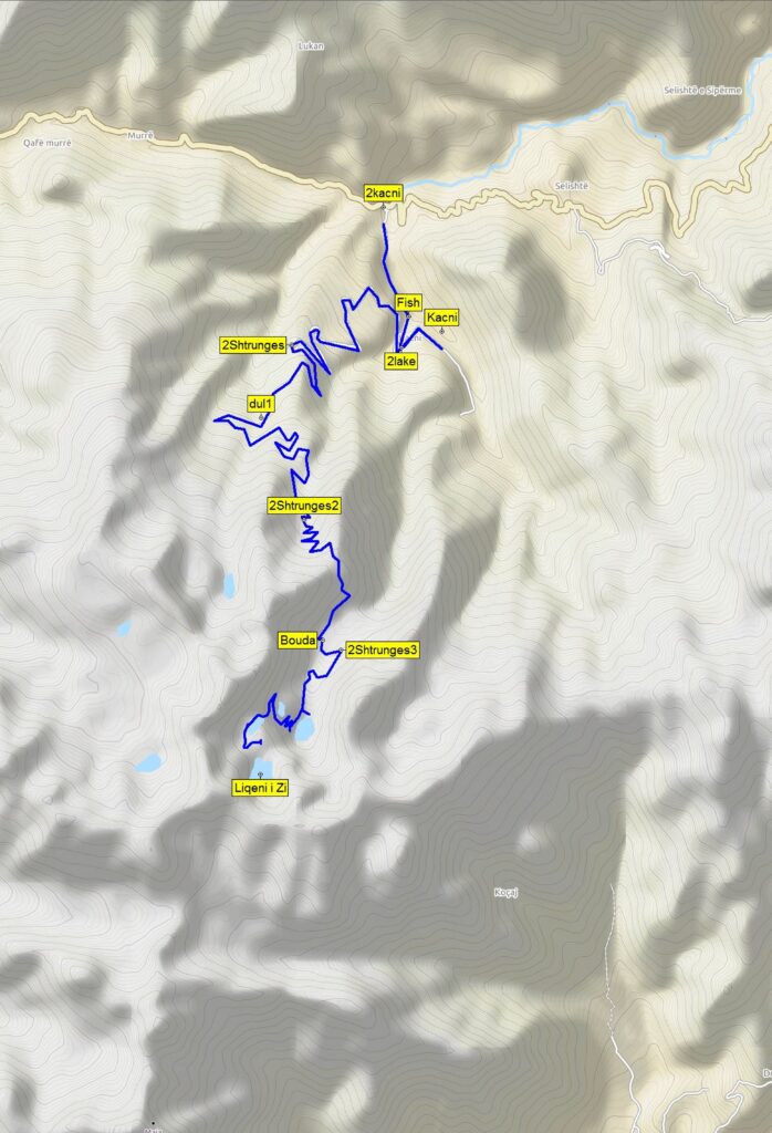 Z cesty mezi Qaf-Murrë a Selishtë odbočuje cesta do údolí přes mostek u pily (2kacni). Před vesnicí Kacni je kavárna, kde mají výborné pstruhy (fish). V zatáčce za kavárnou je za mostkem odboč-ka doprava na kamenitou cestu. Cesta stoupá serpentinami a asi po 4 km je odbočka doleva (2Shtrunges). Cesta rovně pokračuje na jezera Miçekut. Pokračují kamenité serpentiny s překrásnými výhledy kolem opuštěného dolu. Mineme stavbu (2Shtrunges2), v které bydlí horníci z nově otevřeného dolu vlevo nad námi. Zde začíná opravdu velmi obtížné stoupání. Ostré serpentiny, kame-nitá cesta, zejména za deště mohou být i nebezpečné. Místní tudy jezdí dolů s ifami (IFA – východoněmecký terénní náklaďák s obrovskou průchodností) naloženými kládami a vytěženou horninou z dolu u jezer. Nepodceňte skutečnost, že IFA projede a buďte opatrní. Cesta se vyšplhá na hřeben a zase spadne do údolíčka Shtungës. Zde stavěli jednoduchou boudu pro pastevce (bouda). Cesta doleva z rozcestí (2Shtrunges3) za boudou vede kolem hřebene směr vesnice Selishtë. Tato cesta míjí několik dalších pěkných jezer, ale je po cca 7 km přehrazena neprůjezdným závalem. Odbočka doprava kolem aktivního dolu (v roce 2016) nás postupně dovede k několika jezerům. Snažte se dojet nebo dojít až na úplný konec cesty kolem dolu k jezeru Liqeni i Zi – Černé jezero. Cesta není používaná, může být stržená od vody nebo přehrazená padlými stromy. Ale Liqeni i Zi rozhodně stojí za námahu. U jezer stojí za to přespat.