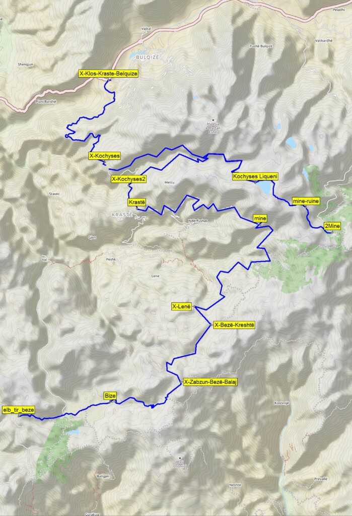 Tato trasa navazuje na trasu 21. Elbasan – Tiranë na křižovatce (elb_tir_beze). Zde odbočíte po kamenité cestě na Bizë. V Bizë je velký vojenský tábor. Cvičí zde společně jednotky zemí NATO. Přejedete most přes hezký potok, minete odbočku na Zabzun -trasa 19. (X-Zabzun-Bezë-Balaj) a před klášterem Teqe e Ballen-jës je u pomníku křižovatka (X-Bezë-Kreshtë).