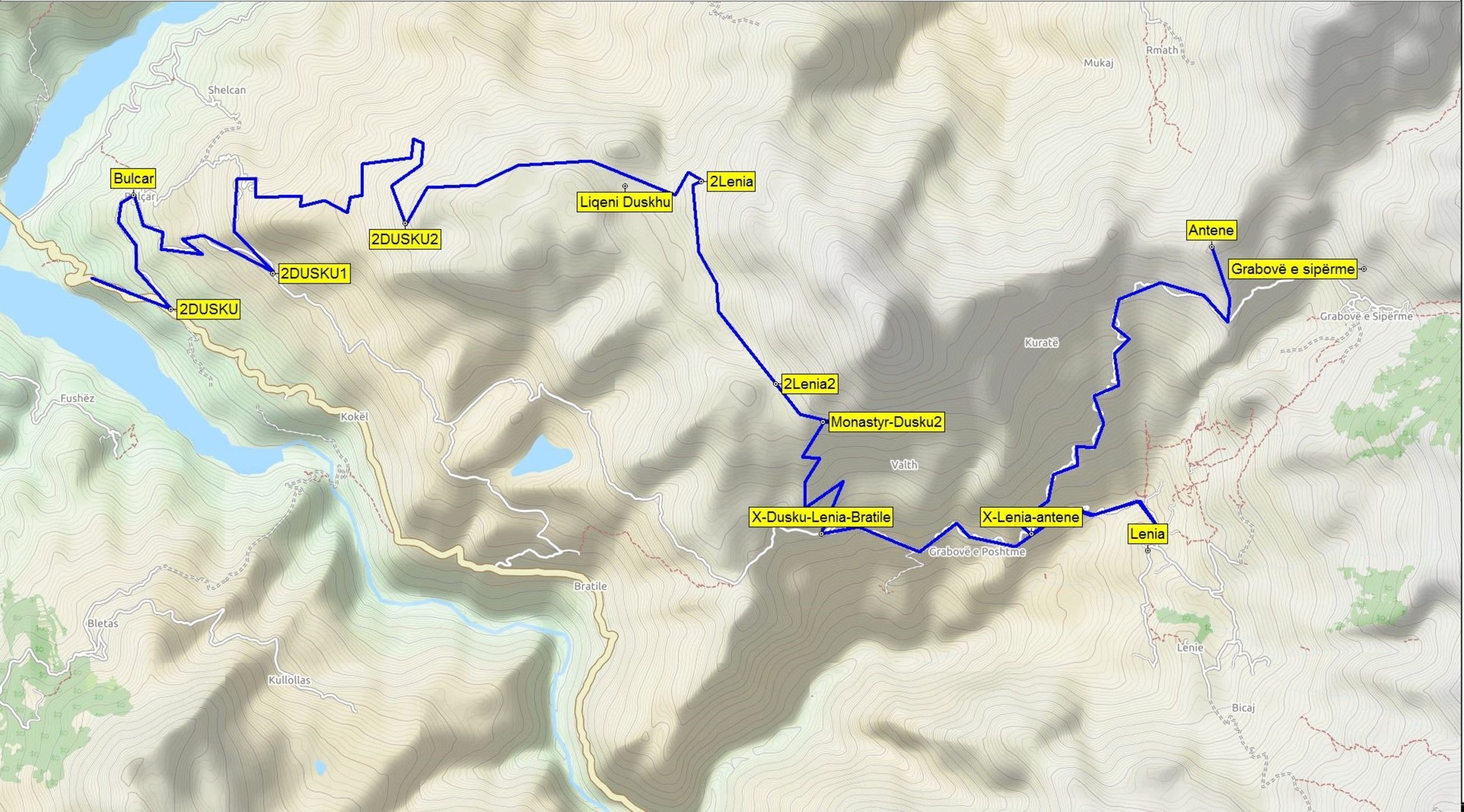 Trasa: odbočka z hlavní silnice Gramsh-Maliq – Bulçar – jezero Dushku – Lënia – Grabovë e Sipërme