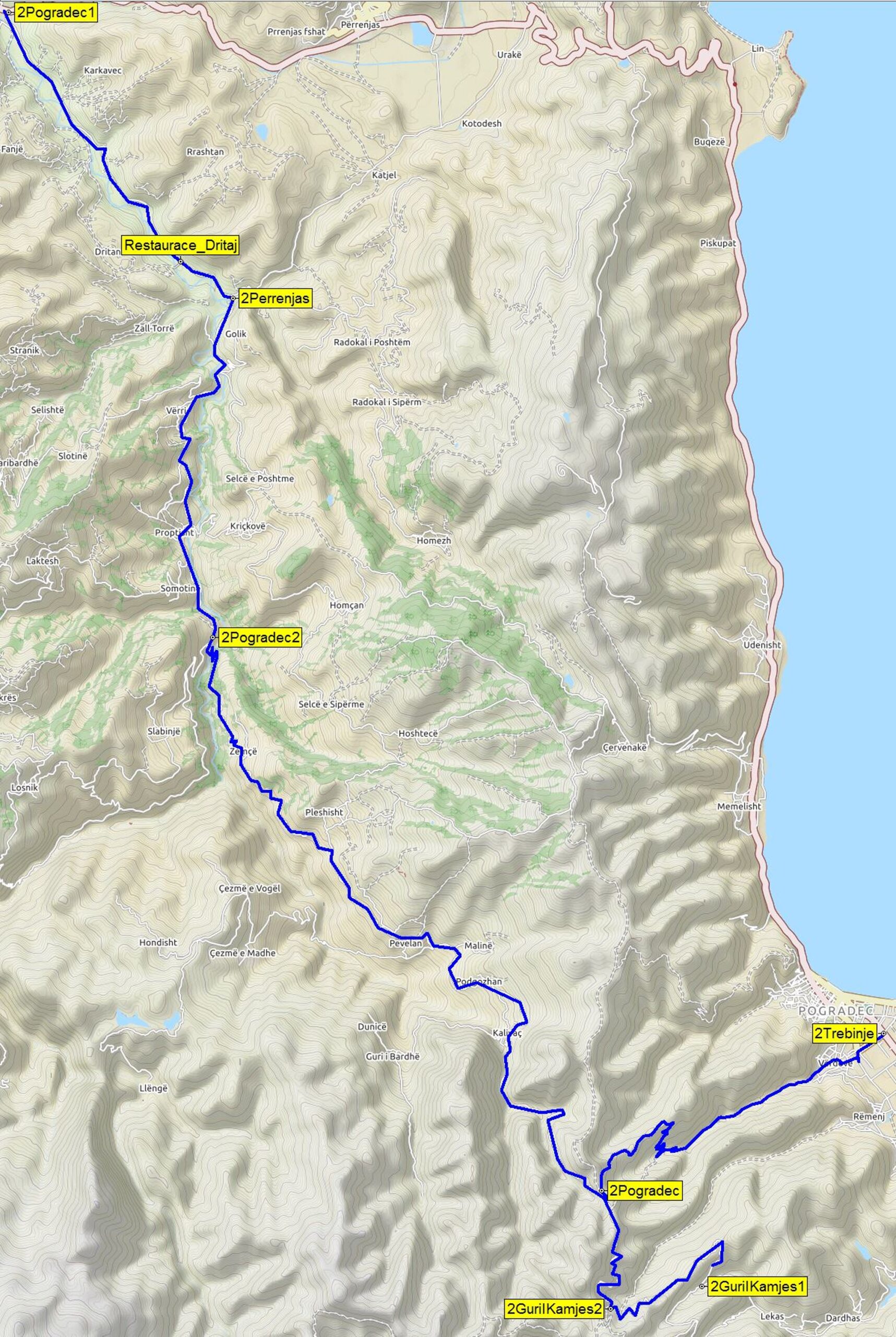 Popis: Rozhodně zajímavější cesta než po silnici kolem Ohrid-ského jezera. Trasa začíná stejně jako trasa na jezera Lukova odbočkou z hlavní silnice Librazhd – Përrenjas (2Pogradec1). Před mostem u restaurace (Restaurace_Dritaj) doleva, přijde asfalt zle-va, odbočíme doprava na mostek (2Perrenjas). Na křižovatce pod vesnicí Slabinjë (2Pogradec2) skrz betonárku přes most. Pak po-řád nahoru přes vesnice Zemçë, Trebinjë, Potkozhan na hřeben. Na hřebeni je křižovatka u pomníku (2Pogradec). Vlevo je velmi slušná cesta prudkými serpentinami do údolí na Rëmenj a Pogra-dec (2Trebinje). Pokud pojedete v opačném směru, tak je odboč-ka na Rëmenj těsně u benzínové pumpy v Pogradci.
