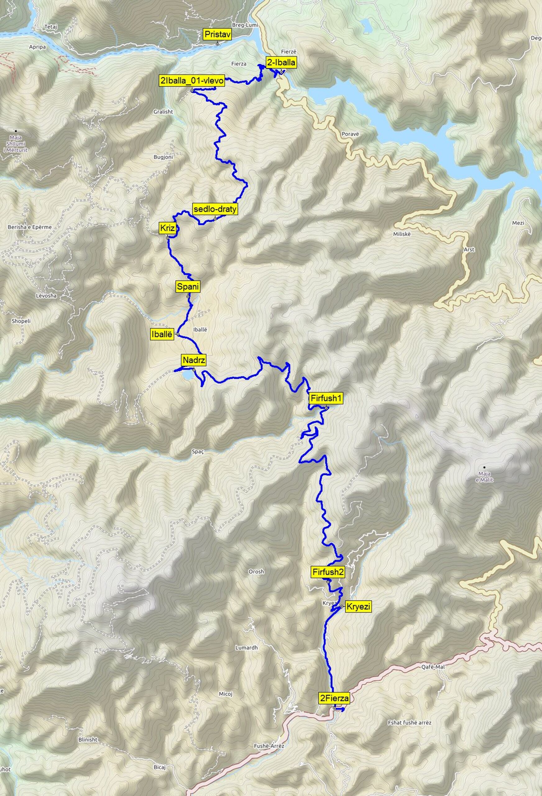 Ve Fierzë za mostem těsně pod přehradou odbočuje blátivá cesta do lomu (fir_fush_01). Vystoupáte nekonečnými serpentinami přes hřeben do sedla pod vedením vysokého napětí (sedlo–draty). Pak cesta klesne na křižovatku se zdánlivě hlavní cestou s křížem. Odbočte po hlavní cestě doleva do vesnice Iballë. Nad vesnicí je pod kaštany příjemné místo na spaní. Všimněte si, že je zde mešita i katolický kostel a lidé jsou úplně v pohodě. Projeďte pod vesnicí a napojíte se na nově postavenou cestu. Kolem nádrže na vodu se přehoupnete přes další hřeben. Následuje moc hezká cesta, která se klikatí ve svahu borovými lesy přes další sedlo. Pak už jen jednoduchý sjezd do Kryezi, kde u školy začíná asfalt. Před Fushe Arres se napojíte na hlavní silnici těsně pod odbočkou na gulagy (fir_fush_07).