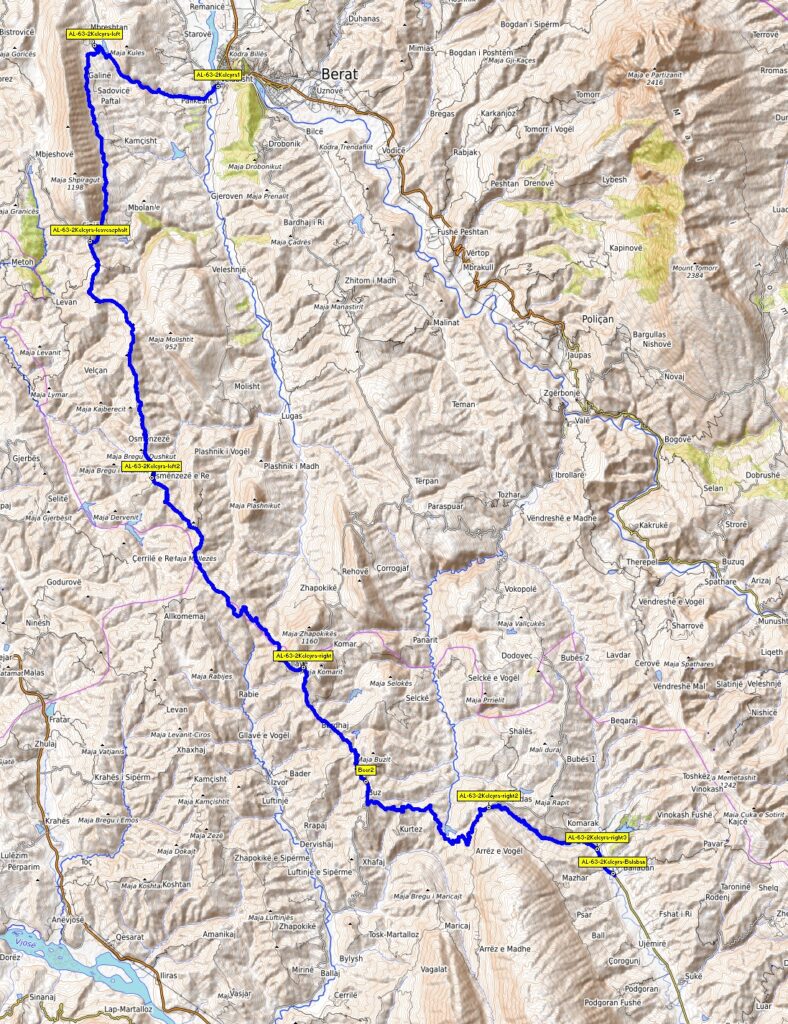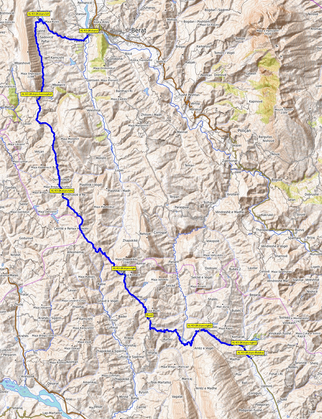 Tato trasa částečně kopíruje trasu 54. Këlcyrë – Poliçan. Z Beratu se vydejte po asfaltu do Mbreshtan, tam doleva a po-řád vzhůru. Na bodě (leaveasphalt) odbočte doleva na šotolinu. Pohodlná prašná cesta se vine po hřebenech. Nalevo jsou krás-né vyhlídky na pohoří Tommorices, vrcholky Maja e Partizanit 2416 m n.m. a Maja e Tomorrit 2384 m n.m., na jaře zasněžené. Projedete malé vesnice Osmënzezë e Re a Gllavë. V Buz se zastavte na pivo, majitelka umí anglicky a občas má i připravené jídlo. Z Balaban začíná asfaltová SH74, která vede až do Kelcyrä.