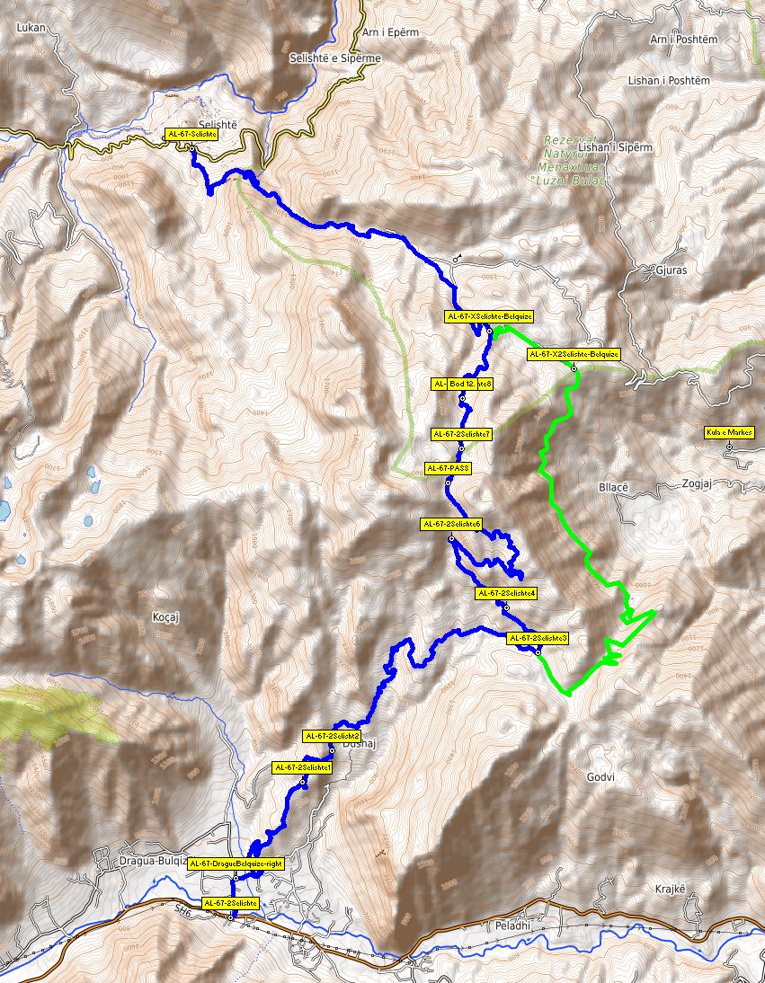 Odbočte (2Selishte) z hlavní silnice SH6 do Drague-Belquizë. Za mostkem hned doprava (Drague-Belquize-right). Stoupejte vzhůru, asfalt rychle skončí. Na bodě (2Selishte3) je rozcestí. Doleva jedete přes vrcholky kopců. Cesta doprava je jednodušší alternativa, která nepřekračuje vrcholky. Ale kdo by jezdil jed-nodušší cestou… Jen pozor na jaře a začátkem léta, na cestě přes vrcholky ještě může být sníh a popadané stromy.