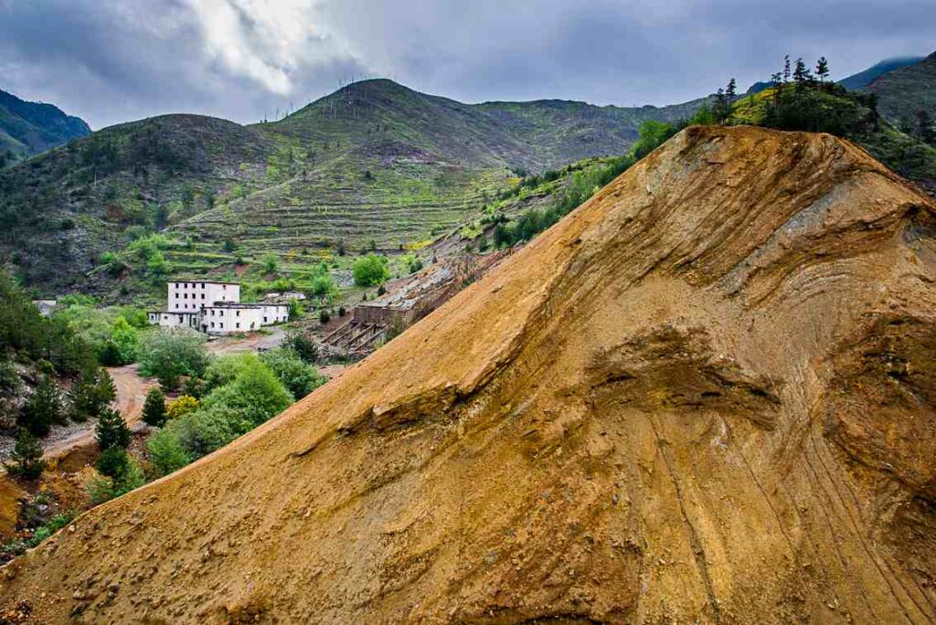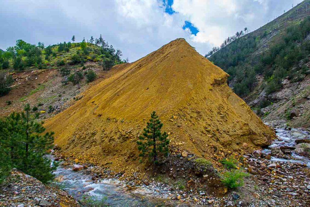 Cesta vede z prudkého kopce kolem velkého portálu činného dolu a postupně se zlepšuje. Sjeďte doprava dolů k budovám dolu Bakriž (mineactive). Hlavní cesta pokračuje dolů z kopce do Goja-ni i Vogël na hlavní silnici. Odbočte vlevo do kopce a po cca 600 m jsou v zatáčce nalevo modrá vrata (blue_gate). Držte se hlavní cesty, po levé ruce uvidíte doly, které jste projeli a pokračujte přes další hřeben.