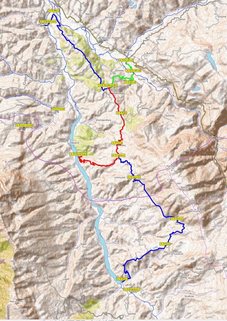 Alternativa je pokračovat z bodu (rightdown) pořád přes kopce a přes vesnice Gurazeza a Zhepë. Pak klesnout do kaňonu (2Zhepo). K mostu je to už jen pár stovek metrů po dobré cestě. Ale, tuto alternativu jsem projel před mnoha léty při rally. Netuším, jak dnes vypadá.