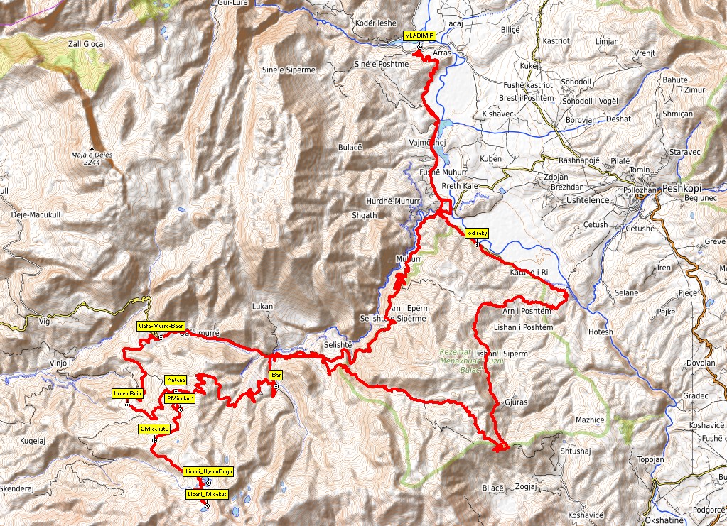 Z Fushë Muhurr to vemte podél Driny proti proudu. Pozor! Je potřeba trefit odbočku na cestu, která obchází úsek stržený od vody. Odbočka je na bodě „Od řeky“. Cesta rovně nečekaně končí smrtelným skokem do řeky. Viz. trasa 74. Lishaj i Sipër-me. Přes vesnici Katund i Ri, pak doprava vzhůru a po cestičkách projet další vesnice až do Gjuras. Za Gjuras se napojíte pod serpentýnami na trasu 23. Shupenzë – Selishtë. Užijete si cestu po kamenech a v Selishtë doleva. Po cca. 2 km odbočte u hospody (otevírá jen občas na oslavy) doleva na vesnici Kačni. V Kačni se stavte v baru u cesty a pozdravte majitele, je to kamarád. Za barem to sekněte na strhanou kamenitou cestu doprava nahoru a užijte si nekonečný výjezd na sbíječce až k bodu (Antena). Pokračujte vzhůru a na bodě 2Micekut2 odbočte na nenápad-nou cestu doprava dolů. Cesta je hodně rozbitá a dovede vás až k prvnímu jezeru Hysen Begu. Kousek dále je jezero Micekut a dvě další. Výlet si můžete okořenit výjezdem na horu Maja e Miçekut 2101 m n.m. Až na sedlo pod vrchol vede cesta. Stejnou cestou se od jezer vraťte zpět k bodu „Antene“. Odsud dolů k ruině domu, bod „Ruin“. Další cesta je fakt málo používaná zkratka na Qafa Murë. V Qafa Murë v obchodě se stavte na pivo a pozdravte dal-šího mého kamaráda. Odsud už jednoduchou cestou přes Selish-të zpět do Fushë Muhurr a Aras.